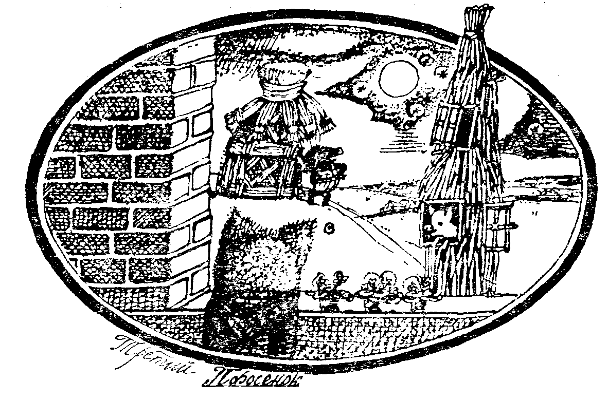 Жила-была на свете старая свинья с тремя поросятами. Сама она уже не могла прокормить своих поросят и послала их искать по свету счастья. Вот пошел первый поросенок и встретил на дороге человека с охапкой соломы. — Человек, человек, дай мне соломы, — попросил поросенок. — Я построю себе дом. Человек дал ему соломы, и поросенок построил себе дом. Вскоре пришел к его дому волк, постучал в дверь и говорит: — Поросенок, поросенок, впусти меня! А поросенок ему: — Не пущу, клянусь моей бородой-бородищей! Тогда волк говорит: — Вот я как дуну, как плюну — сразу снесу твой дом! И волк как дунул, как плюнул — сразу снес весь дом и проглотил поросенка. А второй поросенок встретил человека с вязанкой хвороста и попросил его: — Человек, человек, дай мне хворосту, я построю себе дом. Человек дал ему хворосту, и поросенок построил себе дом. Пришел к его дому волк и говорит: — Поросенок, поросенок, впусти меня. — Не пущу, клянусь моей бородой-бородищей! — Вот я как дуну, как плюну — сразу снесу твой дом! И волк как дунет, как плюнет, как плюнет да как дунет — снес весь дом и проглотил поросенка. А третий поросенок встретил человека с возом кирпичей и попросил его: — Человек, человек, дай мне кирпичей, я построю себе дом. Человек дал ему кирпичей, и поросенок построил себе дом. И к нему тоже пришел волк и сказал: — Поросенок, поросенок, впусти меня! — Не пущу, клянусь моей бородой-бородищей! — Вот я как дуну, как плюну — сразу снесу твой дом! И волк как дунет, как плюнет, как плюнет да как дунет, как дунет да как плюнет, а дом все стоит да стоит. Ну, видит волк: сколько ни дуй, сколько ни плюй — все равно дома не снесешь, и говорит: — Послушай, поросенок, а я знаю, где растет сладкая репа! — Где? — спрашивает поросенок. — В огороде у мистера Смита. Завтра встань пораньше, я зайду за тобой, и мы вместе нарвем репы на обед. — Ладно! — говорит поросенок. — Я тебя подожду. Ты когда придешь? — В шесть. Договорились. А поросенок встал в пять и нарвал себе репы до прихода волка. Ведь тот пришел к шести. — Ты уже встал, поросенок? — спросил волк. — Давно! — ответил поросенок. — Я уже и с огорода вернулся, и полный горшок репы на обед наварил. Волк очень рассердился, но виду не показал, а старался придумать, как бы ему поросенка из дому выманить. — Поросенок, а я знаю, где растет славная яблоня! — Где? — спросил поросенок. — Там внизу, в Веселом саду, — ответил волк. — Хочешь, завтра в пять утра я зайду за тобой, и мы нарвем яблок сколько душе угодно. Только смотри больше меня не обманывай. На том и порешили. А на другое утро поросенок вскочил в четыре часа и во всю прыть побежал за яблоками. Он хотел вернуться до волка. Но сад был далеко, а еще на дерево пришлось лезть. И вот, только поросенок начал спускаться на землю — волк тут как тут. Ну и струхнул поросенок! А волк подошел к нему и говорит: — Ах, это ты, поросенок! Опять раньше меня пришел. Ну, как яблоки, вкусные? — Очень! — отвечает поросенок. — Держи, я тебе брошу одно! И он бросил волку яблоко, но так далеко закинул, что, пока волк бегал за ним, поросенок спрыгнул на землю и убежал домой. На другой день волк как ни в чем не бывало опять пришел к поросенку. — Слушай, поросенок, — сказал он, — сегодня в Шэнклине ярмарка. Пойдешь? — Ну конечно! — ответил поросенок. — Ты когда собираешься? — В три. А поросенок опять вышел из дома пораньше. Прибежал на ярмар