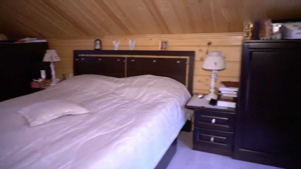 В комнате под крышей поместилась двуспальная кровать, прикроватные тумбочки и два небольших шкафа для хранения.