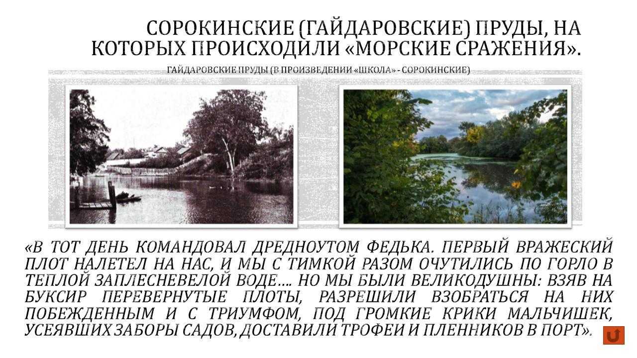 Если по улице Горького пройти или проехать немного ниже, мы увидим пруды, один из которых называют гайдаровским (в бытность Аркадия пруды назывались Сорокинскими).Пожалуй, самыми романтическими незабываемыми эпизодами в коротком детстве Аркадия Голикова остались «морские сражения» на Сорокинских прудах, о которых достоверно рассказано в повести.«В тот день командовал дредноутом Федька. Первый вражеский плот налетел на нас, и мы с Тимкой разом очутились по горло в теплой заплесневелой воде. Однако от удара плот противника тоже остановился. Этого только нам и нужно было. Наш мощный дредноут — огромный, неуклюжий, но крепко сколоченный — на полном ходу врезался в борт неприятельского судна и перевернул его. Оставался еще миноносец из свиного корыта. Пользуясь своей быстроходностью, он хотел было проскочить мимо, но и его опрокинули шестом.Мы с Тимкой забрались на Федькин плот, и теперь только головы неприятельской команды торчали из воды. Но мы были великодушны: взяв на буксир перевернутые плоты, разрешили взобраться на них побежденным и с триумфом, под громкие крики мальчишек, усеявших заборы садов, доставили трофеи и пленников в порт».