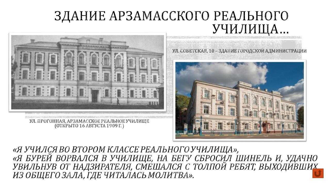 1 сентября 1914 года в первый класс реального училища поступил Аркадий Голиков.18 августа 1918 года в Арзамас прибыл штаб Восточного фронта.Здесь Аркадий обучался военному делу, и его приняли в один из формировавшихся в Арзамасе красноармейских отрядов. Осенью 1918 года он ушел на фронт.В 30-е годы в этом здании располагался Дом Советов.С 1934 года здание полностью было отдано под организовавшийся двухгодичный учительский институт. С 1952 года учительский институт переименован в педагогический. В августе 1966 года вузу присвоено имя А.П. Гайдара. В этом же году состоялось торжественное открытие памятника писателю (скульптор Н. Чугурин).В 2012 году пединститут реорганизован в Арзамасский филилал Нижегородского государственного университета.
