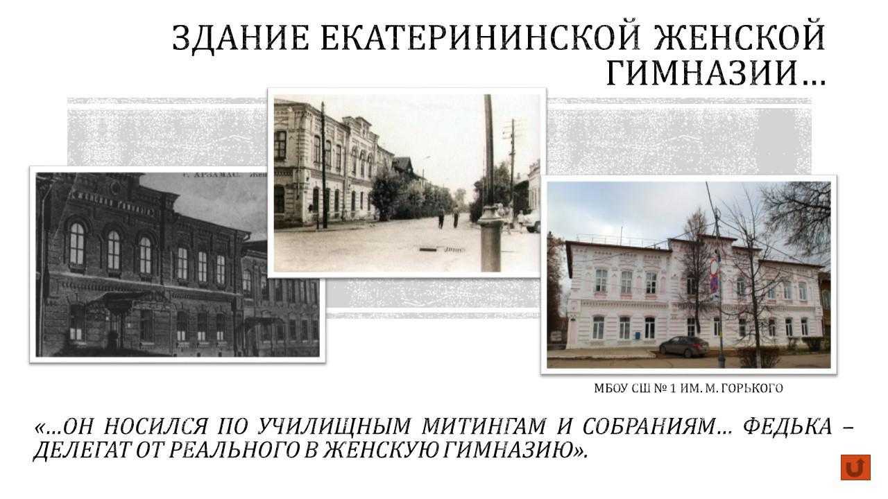 Напротив кинотеатра «Рейста» — каменное здание — бывшее здание Арзамасской Екатерининской женской гимназии. В гимназии училась старшая сестра Аркадия — Наташа. Здесь часто проводились литературно-музыкальные вечера, совместными усилиями гимназисток и реалистов, ставились спектакли, в которых Аркадий принимал активное участие.Аркадий хорошо владел своим голосом, замечательно читал со сцены. Незаурядными декламаторскими способностями он снискал признание не только в реальном училище, но и в женской гимназии, куда мальчики нередко приглашались на вечера. Об одном из выступлений Голикова сохранились воспоминания бывшей гимназистки. Аркадий читал тогда отрывок из поэмы «Крестьянские дети» Н. Некрасова так подкупающе-проникновенно, что давно знакомые строчки зазвучали словно впервые, задели за живое, растрогали. Искренность и задушевность великого поэта были сродни юному исполнителю. Это уже заявил о себе талант.