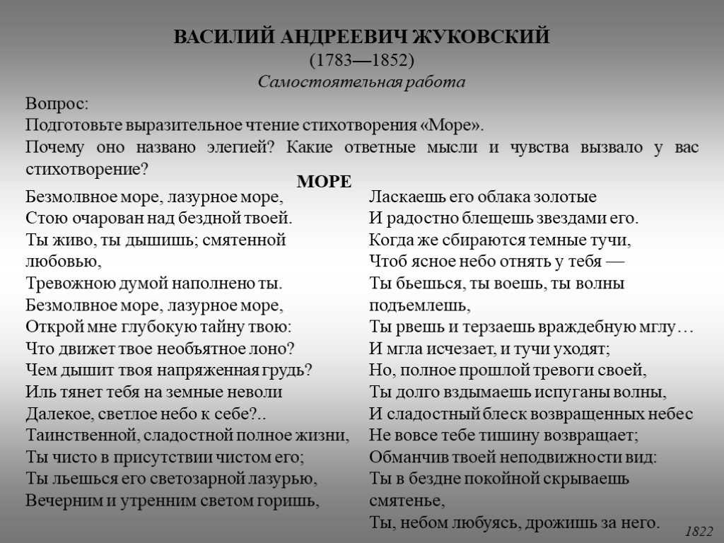 Написано стихотворение в 1822 году и соответствует всем канонам раннего романтизма. В школах изучается, как правило, в девятых классах. Размер элегии – трёхстопный амфибрахий.