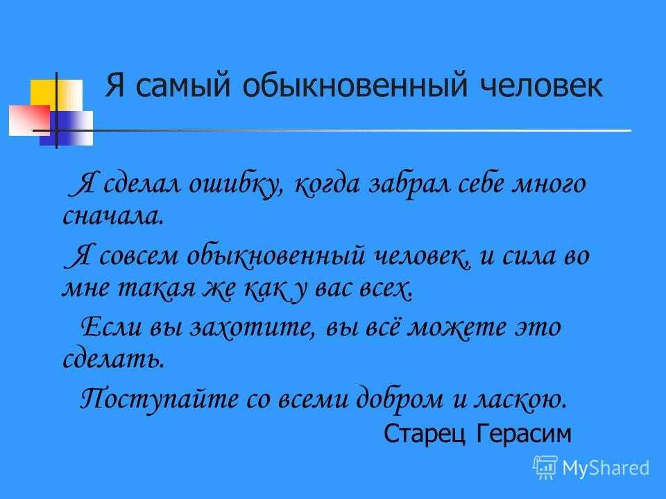 Я самый обыкновенный человек Я сделал ошибку, когда забрал себе много сначала. Я совсем обыкновенный человек, и сила во мне такая же как у вас всех. Если вы захотите, вы всё можете это сделать. Поступайте со всеми добром и ласкою. Старец Герасим