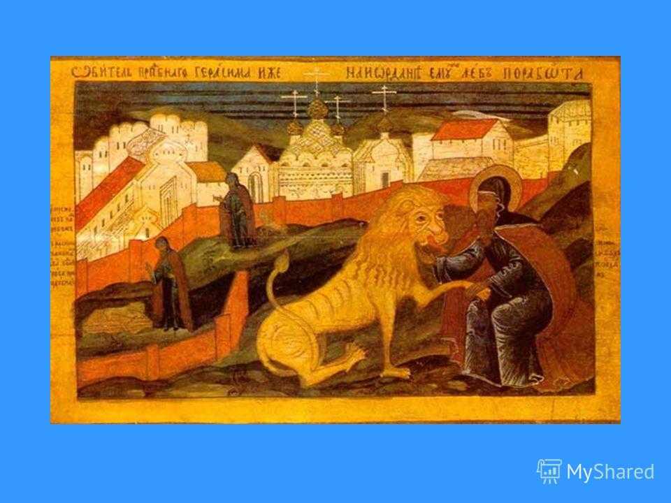 Преображение пустыни У старца выросли тыквы, он начал их сушить и делать из них кувшины, а потом стал относить эти кувшины к источнику, чтобы они годились тем, у кого в не во что захватить с собой воды. Так жил Герасим, и сам питался, и другим людям по силе своей был полезен.