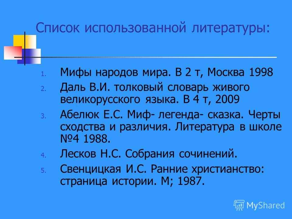 Список использованной литературы: 1. Мифы народов мира. В 2 т, Москва Даль В.И. толковый словарь живого великорусского языка. В 4 т, Абелюк Е.С. Миф- легенда- сказка. Черты сходства и различия. Литература в школе Лесков Н.С. Собрания сочинений. 5. Свенцицкая И.С. Ранние христианство: страница истории. М; 1987.