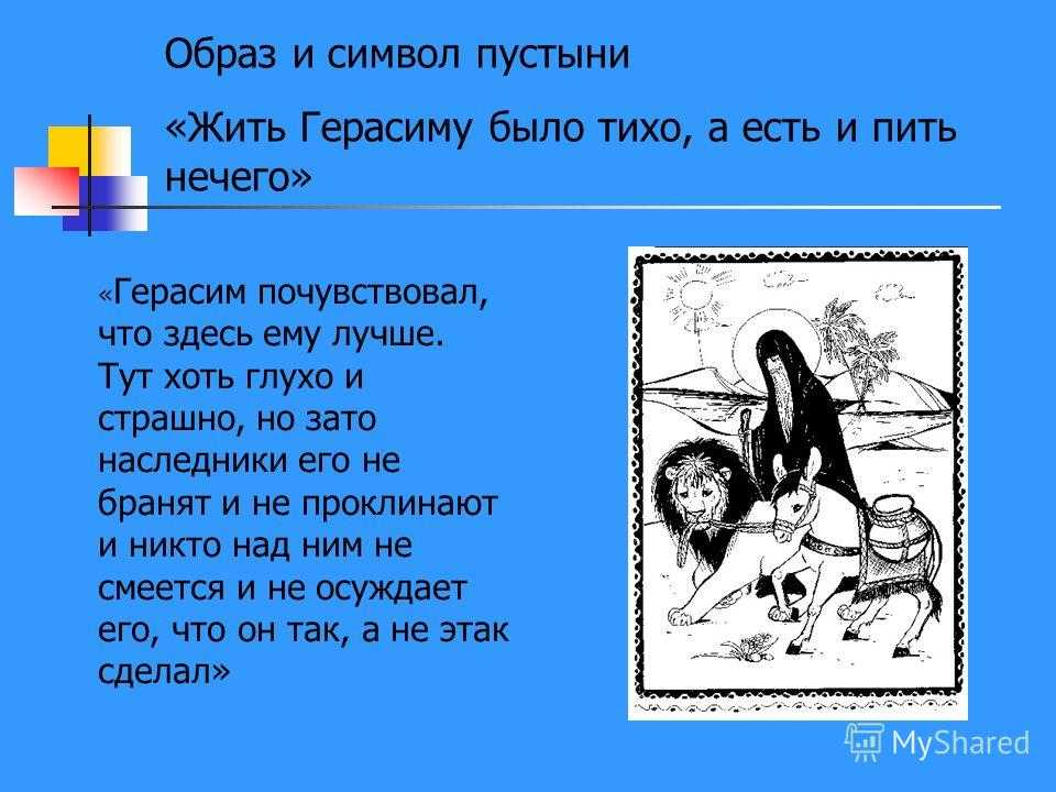 Образ и символ пустыни «Жить Герасиму было тихо, а есть и пить нечего» « Герасим почувствовал, что здесь ему лучше. Тут хоть глухо и страшно, но зато наследники его не бранят и не проклинают и никто над ним не смеется и не осуждает его, что он так, а не этак сделал»
