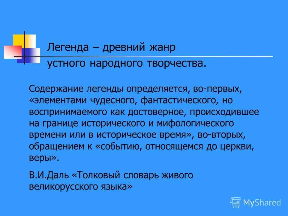 Содержание легенды определяется, во-первых, «элементами чудесного, фантастического, но воспринимаемого как достоверное, происходившее на границе исторического и мифологического времени или в историческое время», во-вторых, обращением к «событию, относящемся до церкви, веры». В.И.Даль «Толковый словарь живого великорусского языка» Легенда – древний жанр устного народного творчества.
