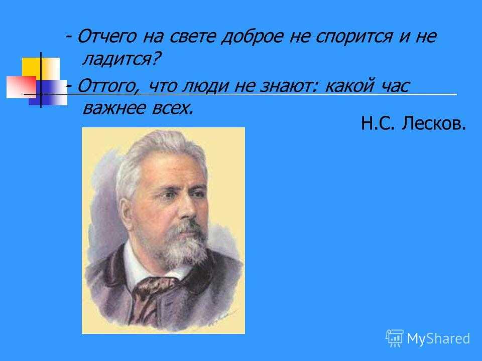 — Отчего на свете доброе не спорится и не ладится? — Оттого, что люди не знают: какой час важнее всех. Н.С. Лесков.