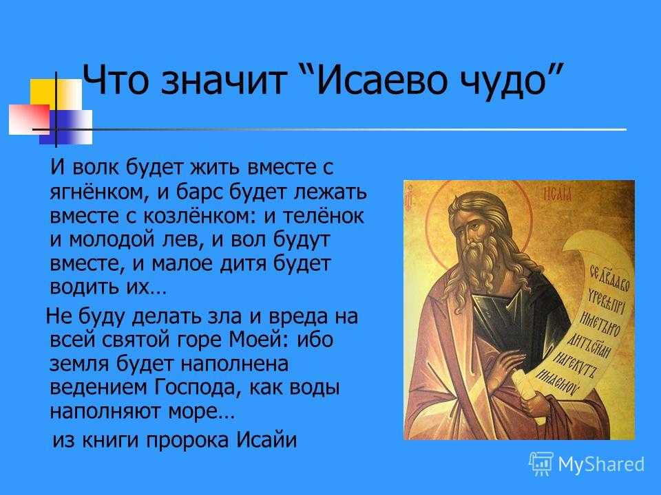 Что значит Исаево чудо И волк будет жить вместе с ягнёнком, и барс будет лежать вместе с козлёнком: и телёнок и молодой лев, и вол будут вместе, и малое дитя будет водить их… Не буду делать зла и вреда на всей святой горе Моей: ибо земля будет наполнена ведением Господа, как воды наполняют море… из книги пророка Исайи