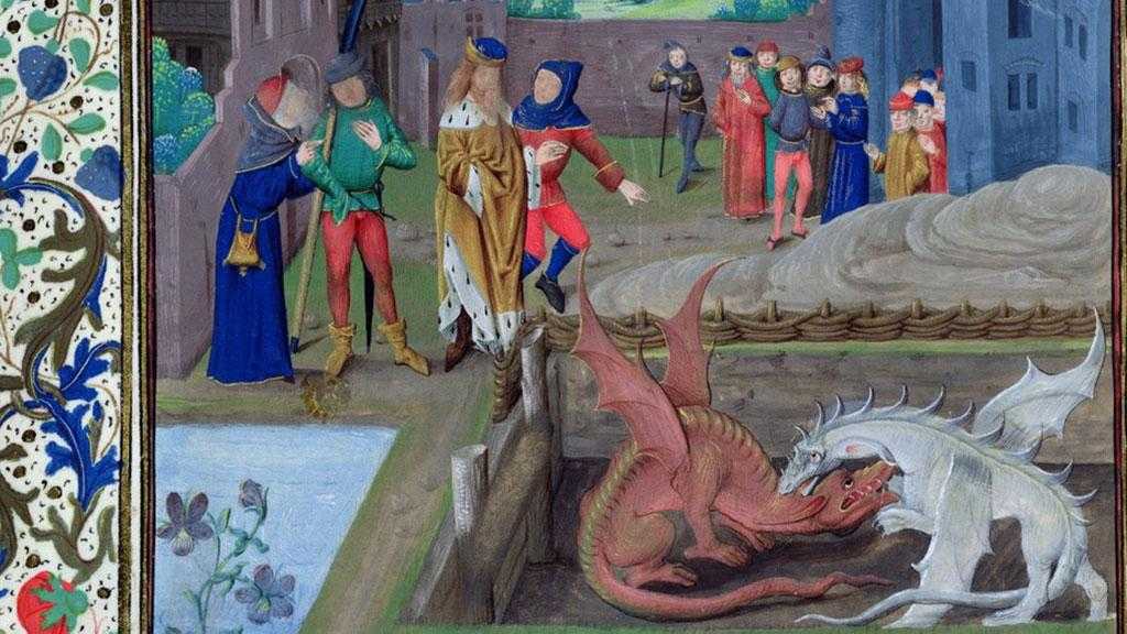Ллевелис сказал: «Высоко в небе идет жестокий бой: сражаются два дракона, красный и белый. И когда один из них получает удар, то издает тот ужасный крик, который разносится по всему твоему королевству. Но беде можно помочь. Вели измерить всю Британию вдоль и поперек, найди ее середину и вырой там глубокую яму. На дно ямы поставь два каменных чана, полных хмельного меда. Драконы почуют его запах, прекратят свой бой и, спустившись в яму, станут пить мед. Напившись, они охмелеют и заснут. Тогда прикажи завернуть их в златотканые ковры и засыпать землей. Яма превратится в подземное озеро, и драконы будут спать на его дне, пока кто-нибудь их не потревожит».