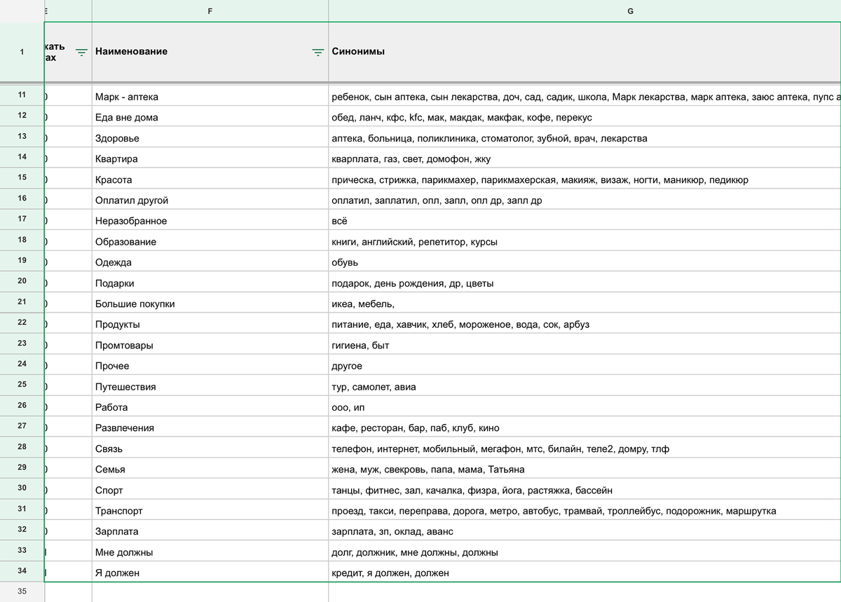 Это список категорий в таблице. Слева — основное название, справа — синонимы. Чтобы писать быстро, вместо «продукты» я пишу «еда», бот сам понимает, о чем речь, и заносит расход в колонку с продуктами