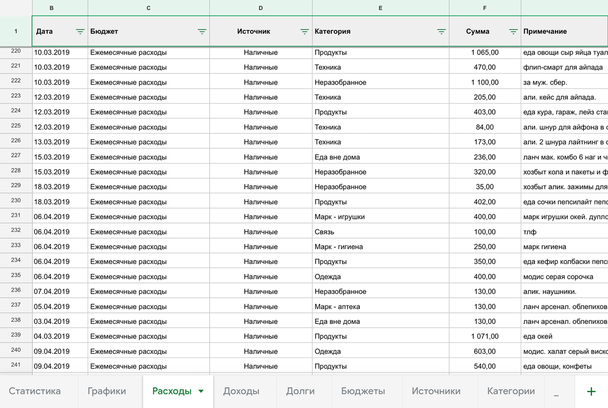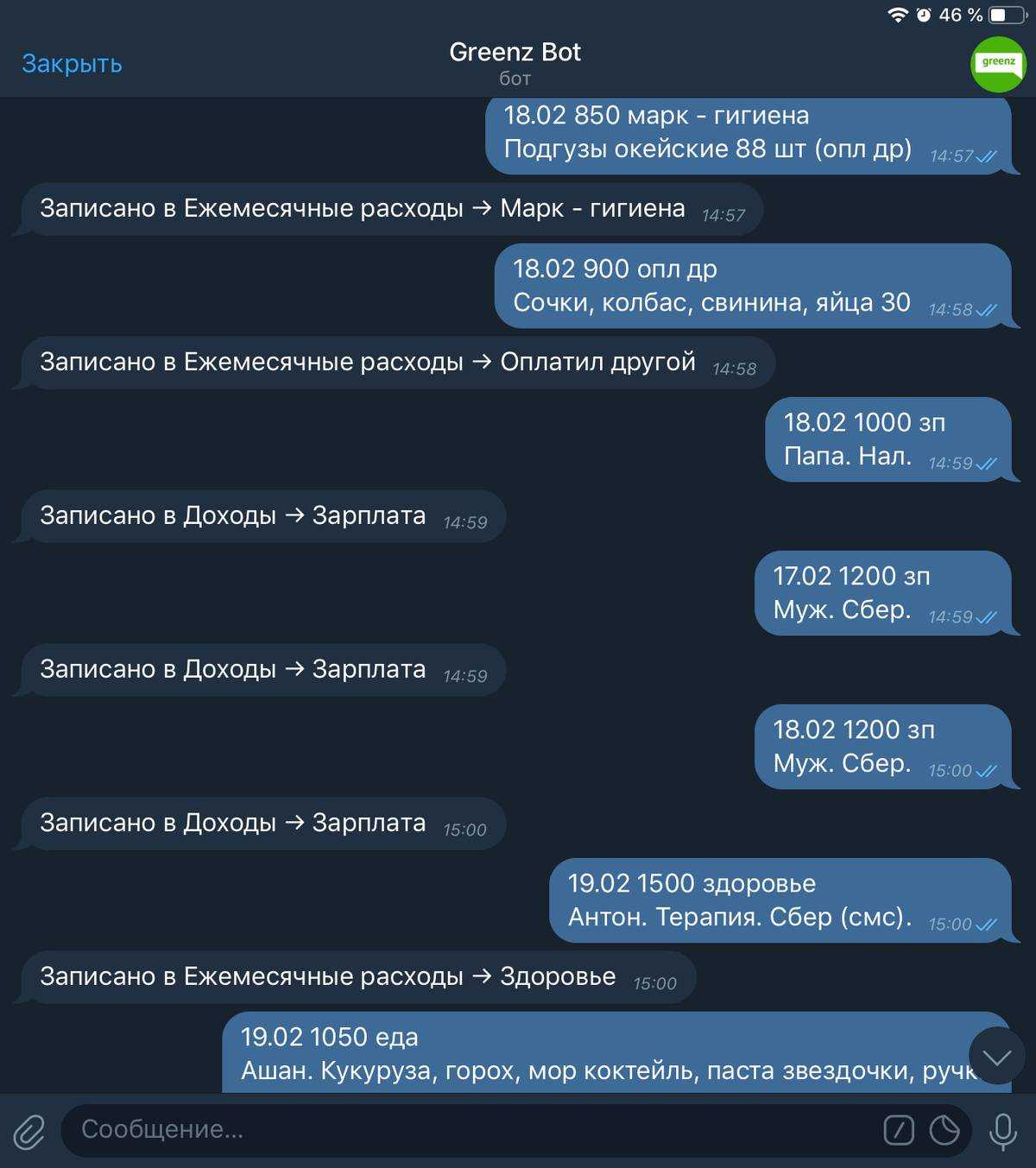 Для учета всех денег использую бота в Телеграме, который сам заполняет гугл-таблицу. Отправляю боту сообщение с датой, суммой, категорией дохода или траты, а следующим абзацем комментарий — от кого, как, кому, что купила, где, зачем. Категории я задала заранее в таблице: ее в любой момент можно открыть и что-то дописать, удалить или посмотреть статистику по любой категории, дате, периоду или какому-то слову.