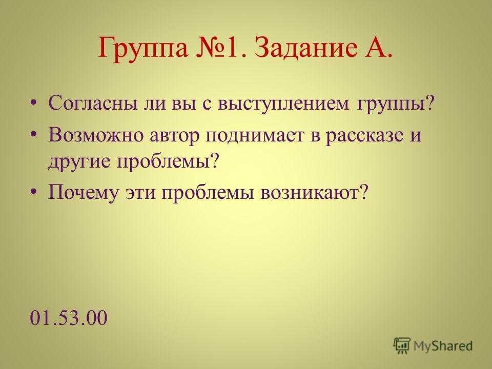 Группа 1. Задание А. Согласны ли вы с выступлением группы? Возможно автор поднимает в рассказе и другие проблемы? Почему эти проблемы возникают?