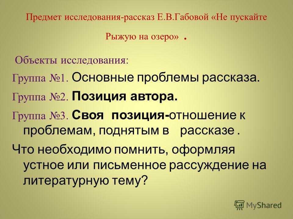 Предмет исследования-рассказ Е.В.Габовой «Не пускайте Рыжую на озеро». Объекты исследования: Группа 1. Основные проблемы рассказа. Группа 2. Позиция автора. Группа 3. Своя позиция-отношение к проблемам, поднятым в рассказе. Что необходимо помнить, оформляя устное или письменное рассуждение на литературную тему?