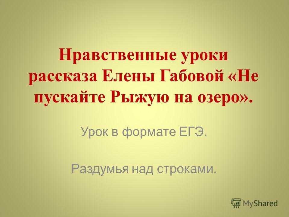 Презентация по предмету «ЕГЭ» на тему: «Нравственные уроки рассказа Елены Габовой «Не пускайте Рыжую на озеро». Урок в формате ЕГЭ. Раздумья над строками.». Скачать бесплатно и без регистрации. — Транскрипт: