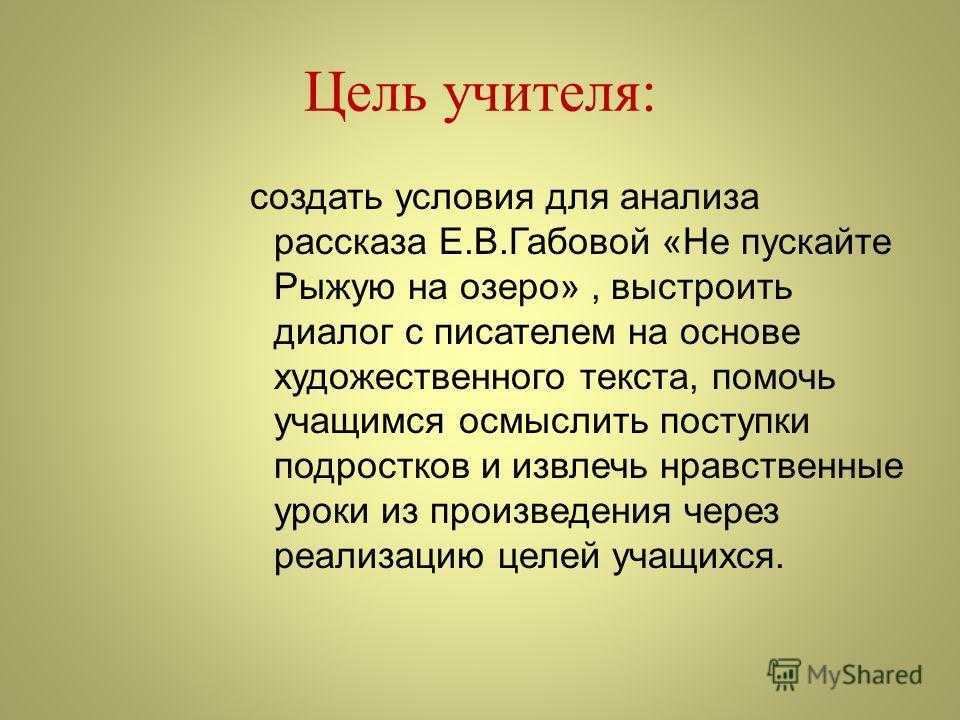 Цель учителя: создать условия для анализа рассказа Е.В.Габовой «Не пускайте Рыжую на озеро», выстроить диалог с писателем на основе художественного текста, помочь учащимся осмыслить поступки подростков и извлечь нравственные уроки из произведения через реализацию целей учащихся.
