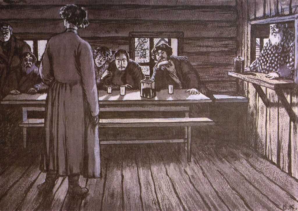 - В развязке рассказчик покидает кабак и удаляется из сельца Колотовка.