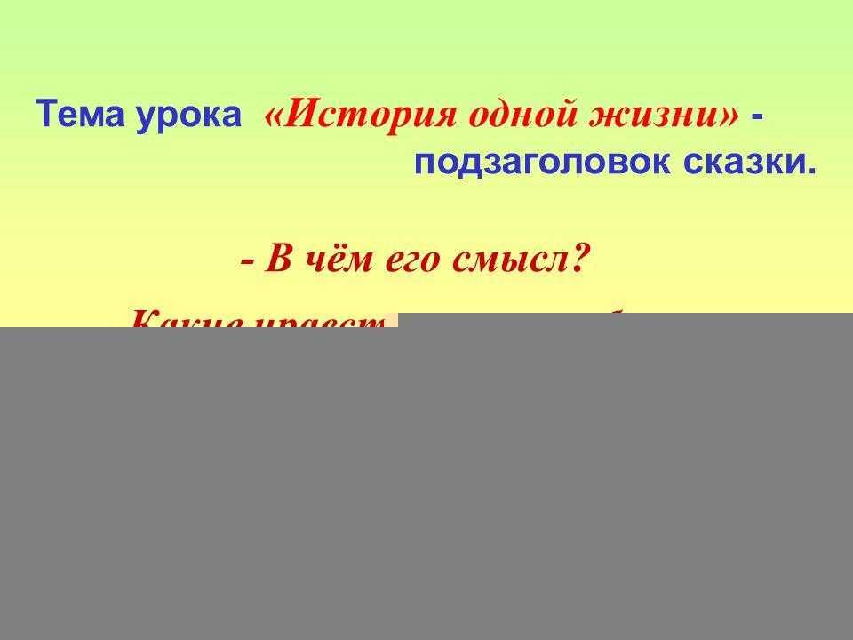 Тема урока «История одной жизни» — подзаголовок сказки. — В чём его смысл? — Какие нравственные проблемы поднимает автор в сказке?